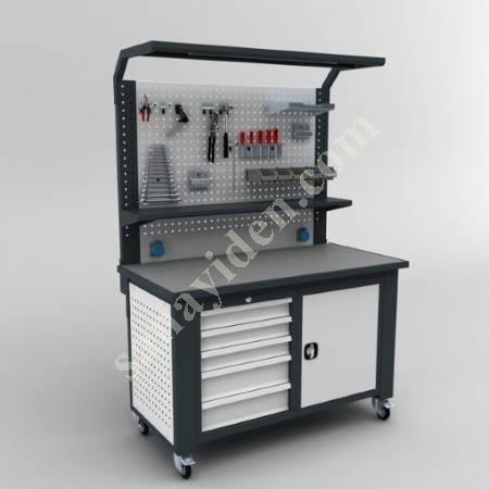Ürünün Teknik Özellikleri: H2050xW1400xD730 mm boyutlarında. Aksesuarlar hariç 158 kg. DKP ve HRP sac malzeme. Elektrostatik toz boya. RAL7016 (Antrasit gri) ve RAL7035 (Açık gri)(Değiştirilebilir) H950xW1340 mm delikli pano ölçüsü. W1340xD250 mm pano rafı W1400xD690 Tabla ölçüsü Standart 30 mm MDF + 2 mm PVC Kaplama tabla.(Değiştirilebilir) 2 adet kapaklı 220 V topraklı priz. (IP44 Koruma Sınıfı) LED Aydınlatma (1x14W Anahtarlı Led Band Armatür) Genel Özellikler: Ağır hizmet ortamlarında tekerlekli ve sorunsuz olarak kullanılabilecek şekilde tasarlanmıştır. Sağlam ve dayanıklı metal iskelet üzerine tüm aksamlar sabitlenmiştir. Bütün elektrik ve hareketli aksamları tozlu ve nemli ortamlarda kullanıma uygundur. Bütün çekmece ve kapaklar kilitlenebilir özelliktedir. Çekmecelerin kendiliğinden açılmasını önleyen basmalı mandal sistemi kullanılmaktadır. Çekmecelerde ağır sanayi tipi ve uzun ömürlü rulmanlı çelik raylar kullanılmaktadır. Bozuk zeminler için ayaklarda rotil ayar vidaları bulunmaktadır. Çekmeceler istenildiğinde seperatör ile bölümlenebilir. Pano kancaları ve aksesuarlarında geniş seçenekler mevcuttur. Yüksek boya dayanıklılığı için boyadan önce fosfatlama işlemi uygulanmaktadır. Darbe ve çizilmelere karşı en yüksek dayanıklılığı sağlamak için pütürlü toz boya kullanılmaktadır. Kullanıma uygun olarak geniş tabla çeşitleri opsiyonel olarak sunulmaktadır. 2 yıl garanti ve yedek parça desteği sunulmaktadır.