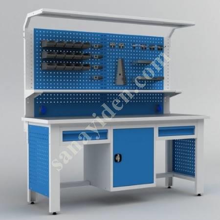 Ürünün Teknik Özellikleri: H2050xW2000xD730 mm boyutlarında. Aksesuarlar hariç 160 kg. DKP ve HRP sac malzeme. Elektrostatik toz boya. RAL5015 (Mavi) ve RAL7035 (Açık gri)(Değiştirilebilir) H950xW1910 mm delikli pano ölçüsü. W1910xD250 mm pano rafı W2000xD690 Tabla ölçüsü Standart 30 mm MDF + 2 mm PVC Kaplama tabla.(Değiştirilebilir) 2 adet kapaklı 220 V topraklı priz. (IP44 Koruma Sınıfı) LED Aydınlatma (1x14W Anahtarlı Led Band Armatür) Genel Özellikler: Ağır hizmet ortamlarında sorunsuz olarak kullanılabilecek şekilde tasarlanmıştır. Sağlam ve dayanıklı metal iskelet üzerine tüm aksamlar sabitlenmiştir. Bütün elektrik ve hareketli aksamları tozlu ve nemli ortamlarda kullanıma uygundur. Bütün çekmece ve kapaklar kilitlenebilir özelliktedir. Çekmecelerin kendiliğinden açılmasını önleyen basmalı mandal sistemi kullanılmaktadır. Çekmecelerde ağır sanayi tipi ve uzun ömürlü rulmanlı çelik raylar kullanılmaktadır. Bozuk zeminler için ayaklarda rotil ayar vidaları bulunmaktadır. Çekmeceler istenildiğinde seperatör ile bölümlenebilir. Pano kancaları ve aksesuarlarında geniş seçenekler mevcuttur. Yüksek boya dayanıklılığı için boyadan önce fosfatlama işlemi uygulanmaktadır. Darbe ve çizilmelere karşı en yüksek dayanıklılığı sağlamak için pütürlü toz boya kullanılmaktadır. Kullanıma uygun olarak geniş tabla çeşitleri opsiyonel olarak sunulmaktadır. 2 yıl garanti ve yedek parça desteği sunulmaktadır.