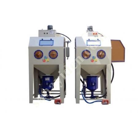 Kumlama kabinlerimiz siyah sactan mamul,dışı darbe ve çizilmeye dayanıklı likit fırın boyalıdır. Kabin iki yandan kapaklı olup ergonomik kullanıma sahiptir. Kabin ve kapak içleri aşınmaya dayanıklı tabii kaucuk ile kaplanmıştır. Kapaklar gömme olup özel conta takviyelidir,tam sızdırmazlık sağlanmıştır. Kabin ön kısımda iki adet el delik flanşı ile bunlara bağlı uzun ömürlü kumlama eldivenleri ve değişebilir camlı, geniş görüş açılı gözetleme penceresi bulunmak- tadır. Kabin sağ kısımda seyyar sehpa ile arabalı döner tabla bulunmaktadır. Basınçlı hava devresinde yağ ve su tutucu filtre,manometreli regülatör,ayak kumandalı,muhafazalı kilitli tip pedal valf bulunmak- tadır. Uzun ömürlü BOR KARBÜR kumlama nozulu ile teslim edilmektedir. Tip :GM Ölçüler :1000 x 820 x 820 mm Yerden Yükseklik :1740 mm Hava Tüketimi :300 - 1000 lt / dak Çalışma Basıncı :2 - 12 Bar Yükleme Kapasitesi :200 kg Aydınlatma :220 V - 2X18 W Ağırlık :195 kg MODEL AĞIRLIK EBATLAR HAVA NOZULU KUM NOZULU HAVA TÜKETİMİ KG mm mm mm LT/DK 800 P 225 800 x 1300 x 1650 2 6 250-350 1000 P 250 1000 x 1300 x 1650 2,5 6 300-400 1200 P 275 1200 x 1300 x 1700 3 7 400-500 STANDART AKSESUARLAR TOZ TOPLAMA FİLTRESİ KUMLAMA TABANCASI EMNİYET DONANIMI