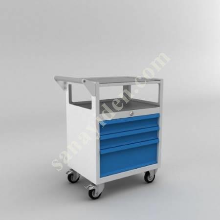 Ürünün Teknik Özellikleri: H835xW600xD450 mm boyutlarında. Aksesuarlar hariç 32 kg. DKP ve HRP sac malzeme. (0,80 – 4,00 mm ) Elektrostatik toz boya. RAL7035 (Açık Gri) ve RAL5015 (Mavi) (Değiştirilebilir) Tabla 2,50 mm petek desenli PVC kaplıdır. Orta sanayi tipi tekerlek takımı (R100) (2 adet frenli, 2 adet sabit) Çekmece Ölçüleri: 2 adet 100’lük çekmece (iç ölçü: H70xW400xD480mm 1 adet 200’lük çekmece (iç ölçü: H170xW400xD480mm) Genel Özellikler: Ağır hizmet ortamlarında sorunsuz olarak kullanılabilecek şekilde tasarlanmıştır. Bütün çekmece ve kapaklar kilitlenebilir özelliktedir. Çekmecelerin kendiliğinden açılmasını önleyen basmalı mandal sistemi kullanılmaktadır. Çekmecelerde teleskopik raylar kullanılmaktadır. Çekmece başı taşıma kapasitesi 40 Kg’dır. Yüksek boya dayanıklılığı için boyadan önce fosfatlama işlemi uygulanmaktadır. Darbe ve çizilmelere karşı en yüksek dayanıklılığı sağlamak için pütürlü toz boya kullanılmaktadır.